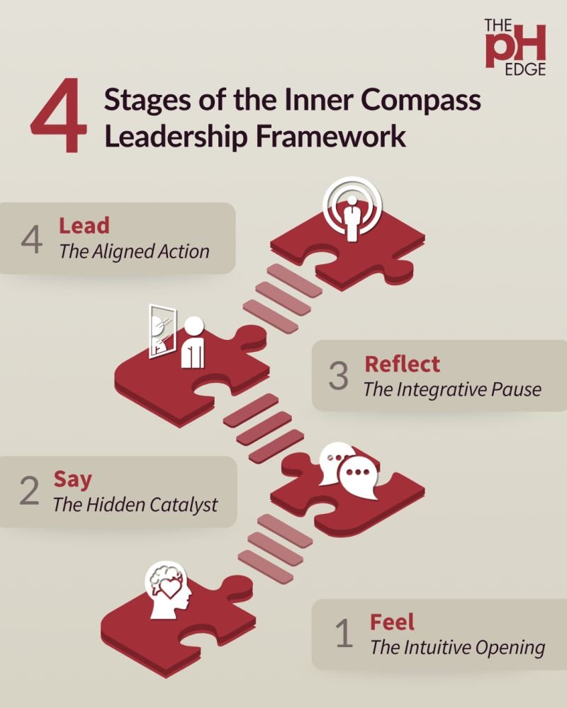 The Inner Compass Leadership Framework is now the lens I bring into my coaching and leadership work. It’s not designed to fix. It’s designed to realign. It invites leaders to move through four core, interconnected phases, each representing a movement inward before turning outward.